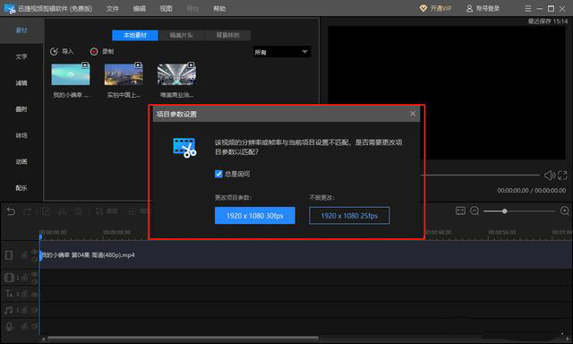 添加素材后,有可能会出现项目参数设置窗口,这是提醒我们,导入的视频分辨率或帧率与设置的项目参数不匹配,可以选择更改项目参数的,大家可以试试。