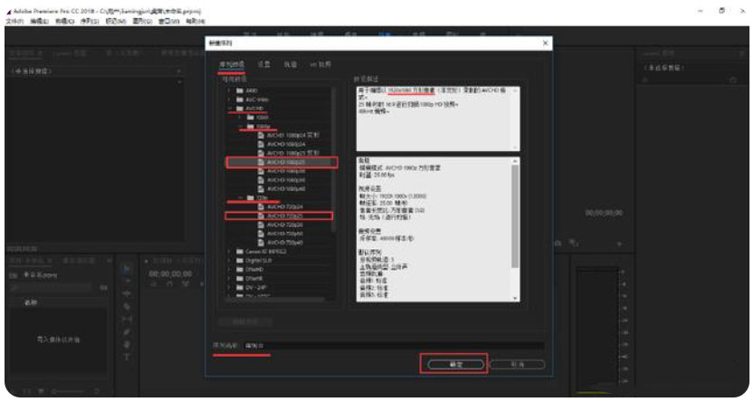 2.新建序列-点文件-新建序列-序列预设-AVCHD-1080P-AVCHD 1080P25(1920*1080)或者选择720P-AVCHD 720P25(12808*720)都可以的-序列名称(自己命名)-确定;