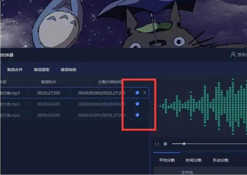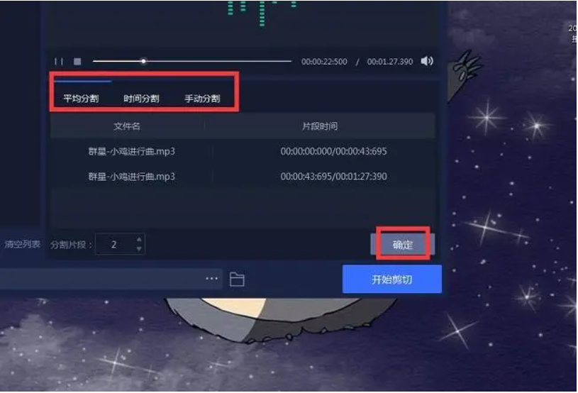 文件导入后,需要我们设置设置剪切的片段啦!有三种方法可以对音频进行剪切,一是“时间分割”、二是“平均分割”、三个“手机分割”,每种剪切的方法都是不一样的,所以大家按照自己喜欢的剪切方法来哦!