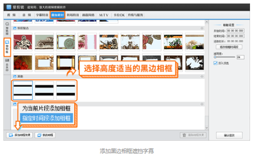 点击“叠加素材”-“加相框”,在“其他”类别中,找到黑边相框,选择黑边高度合适的相框。点击“添加相框效果”按钮,同样选择“指定时间段添加相框”,选取字幕出现的时间段进行添加即可。