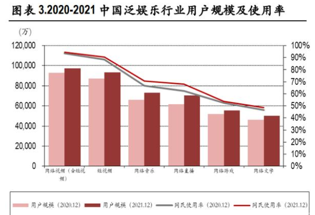 与传统的文字或图片传播方式相比,视频内容更加生动丰富,用户的实时参与和互动也更自然,适合互联网碎片化的传播趋势。根据数据,2021 年 12月短视频行业月人均使用时长增长至 53.2 小时,总时长占全网总时长比例达 25.7%,超过即时通讯成为用户网络时长最长的行业。2021 年 12 月数据表明,短视频的用户数量远超音乐、直播、游戏等其他泛娱乐方式,网民使用率仍在提升, 短视频已经成为人们非常重要的线上社交和娱乐方式。