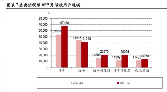 根据 数据统计,2021 年 12月抖音、快手两大短视频平台月活量分别为 6.72 亿、4.11 亿, 其余排名前 5 的同类 APP 也均隶属于快手系或字节系,短视频行业的双寡头格局已经确立。短视频平台同时具有社交和内容属性,头部效应强于长视频、游戏等其他内容形态,但弱于社交、通讯平 台,因此我们认为双寡头格局还将持续。而微信视频号,我们更倾向认为它是丰富微信内容形态、 探索变现空间的新模块,由于强熟人社交属性,以及在内容运营方面并不激进,我们认为中短期内 视频号难以撼动抖音和快手的地位。